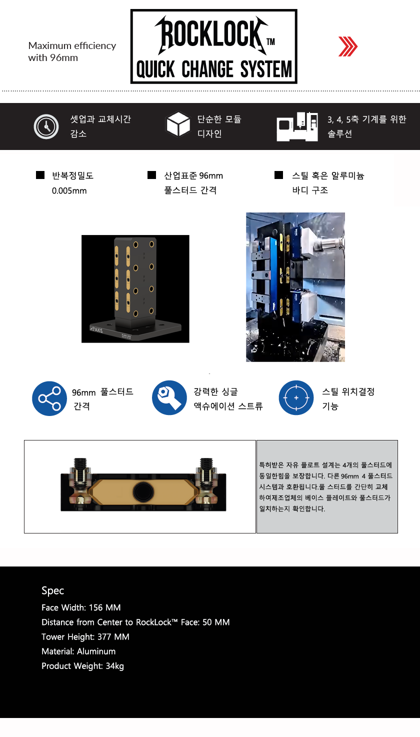 혁신적인 퀵 체인지 시스템: 96mm RockLock 퀵 체인지 메커니즘을 통해 다양한 설정 간에 빠르게 전환하여 가동 중지 시간을 크게 줄이고 생산성을 높일 수 있습니다. 96mm 인터페이스는 안전하고 반복 가능한 잠금을 보장하여 모든 변경에서 일관된 정확성을 보장합니다.
