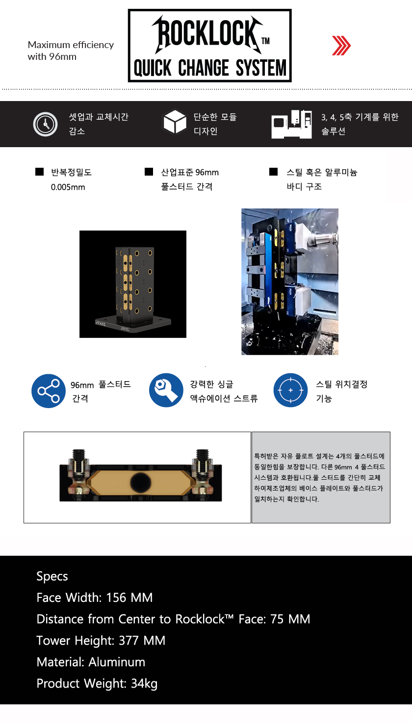 혁신적인 퀵 체인지 시스템: 96mm RockLock 퀵 체인지 메커니즘을 통해 다양한 설정 간에 빠르게 전환하여 가동 중지 시간을 크게 줄이고 생산성을 높일 수 있습니다. 96mm 인터페이스는 안전하고 반복 가능한 잠금을 보장하여 모든 변경에서 일관된 정확성을 보장합니다.