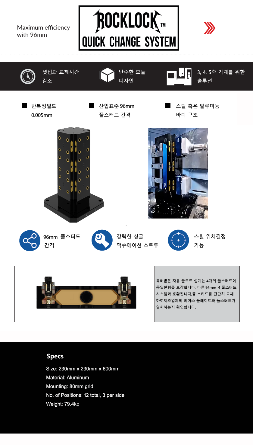 혁신적인 퀵 체인지 시스템: 96mm RockLock 퀵 체인지 메커니즘을 통해 다양한 설정 간에 빠르게 전환하여 가동 중지 시간을 크게 줄이고 생산성을 높일 수 있습니다. 96mm 인터페이스는 안전하고 반복 가능한 잠금을 보장하여 모든 변경에서 일관된 정확성을 보장합니다.